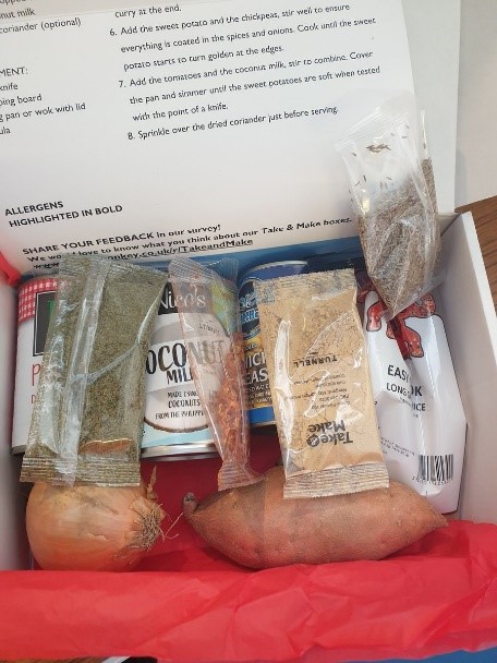 The take and make boxes, pictured above, are a healthy meal kit. They have a recipe card, link to a video showing how to prepare the meal and everything you need to make a family meal. It’s not just a delicious meal but a chance for older children to enjoy cooking and develop a love of fresh food.